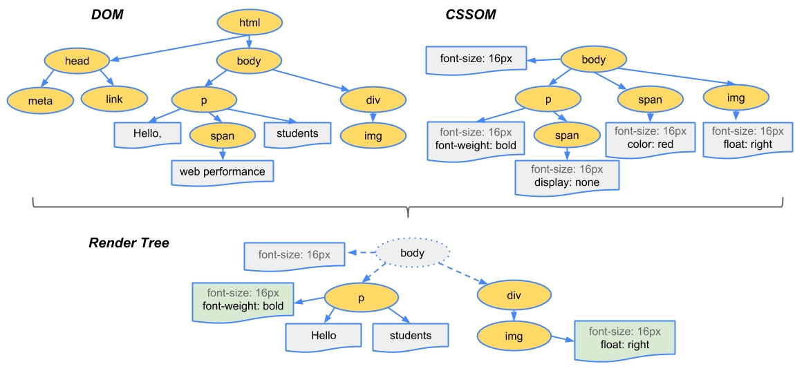 DOM tree 和 CssDOM tree 合并成 render tree, render tree 中每个 node 都有自己的 style,而且 render tree 不包含隐藏的节点(比如